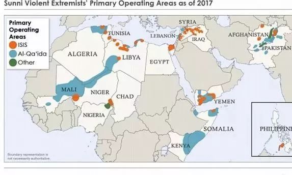 基地组织活动的主要区域包括非洲、中东和南亚的部分地区。(CIA)