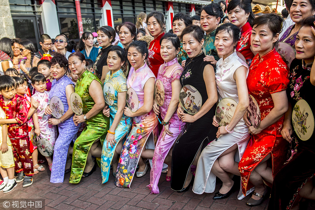当地时间2018年8月19日,巴西圣保罗,当地举办“旗袍快闪”活动,近百名华人女子和孩子身穿中国传统旗袍,和着中国传统音乐在街头表演,分外吸人眼球。