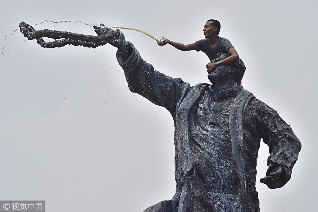 印国会纪念前总理诞辰 甘地雕像洗"牛奶浴"