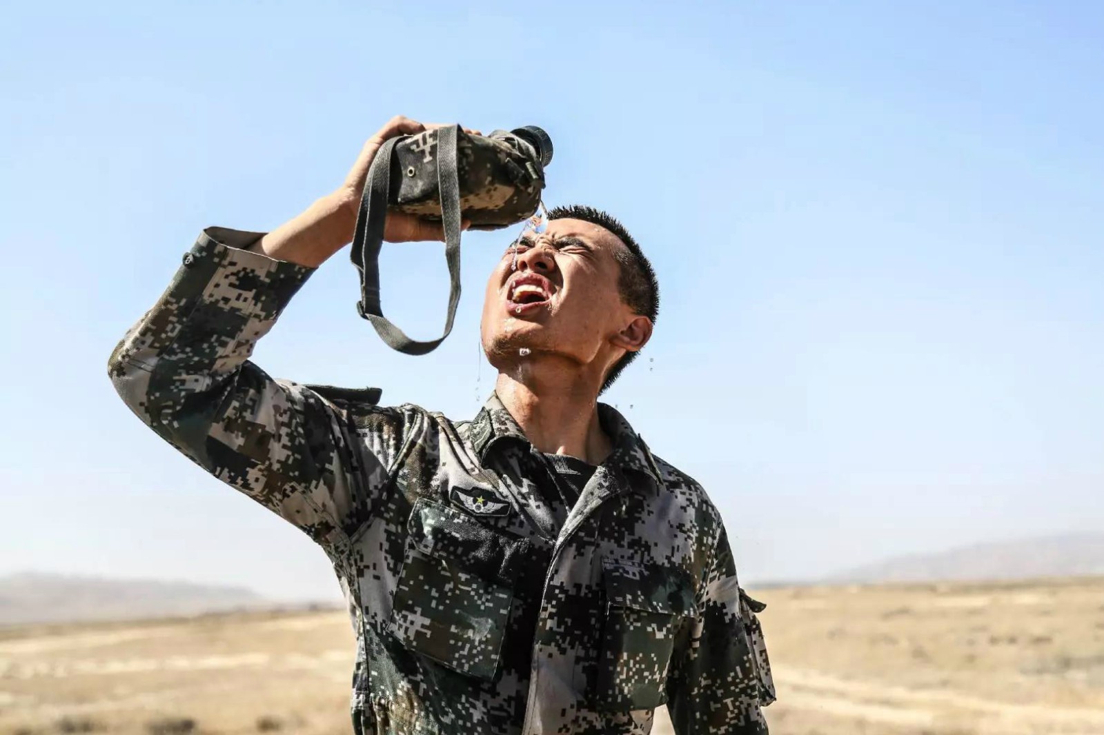 战士们在实弹射击演练中补充水分。