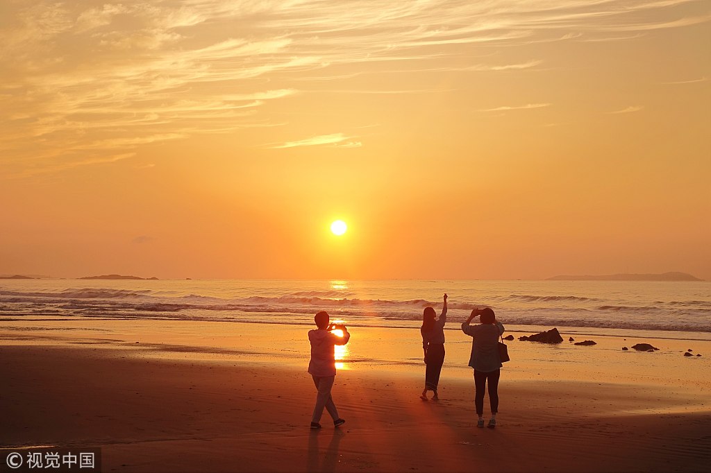2018年8月21日,日出时的青岛西海岸石雀滩海滨美轮美奂。当日早晨,青岛秋高气爽,西海岸石雀滩海滨空气清新,视野通透。朝阳从海平面上冉冉升起,一派祥和、静美景象。