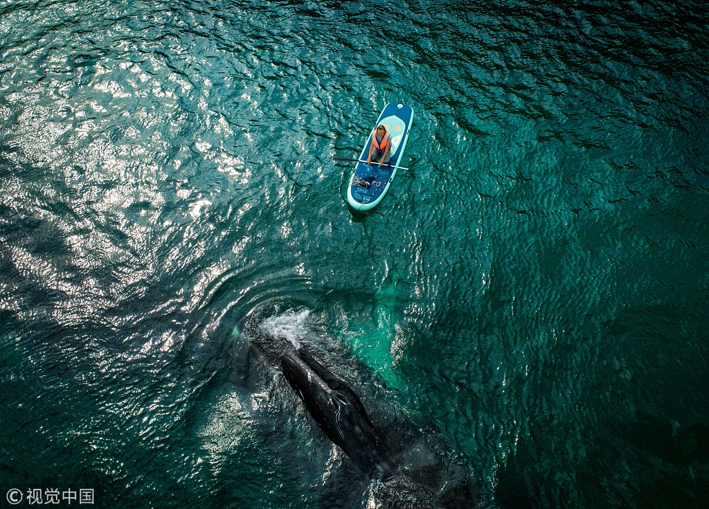 航拍俄罗斯海湾弓头鲸 海洋巨兽与冲浪者和谐同游