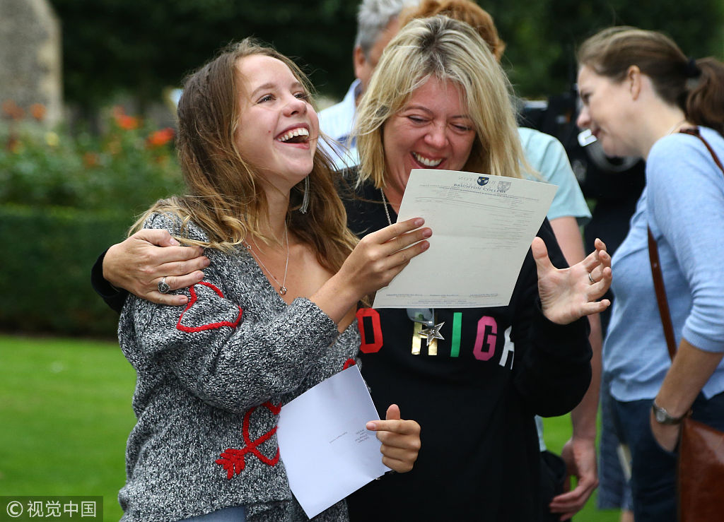 当地时间2018年8月23日,英国“中考”成绩出炉,学生领取考试成绩难掩喜悦。