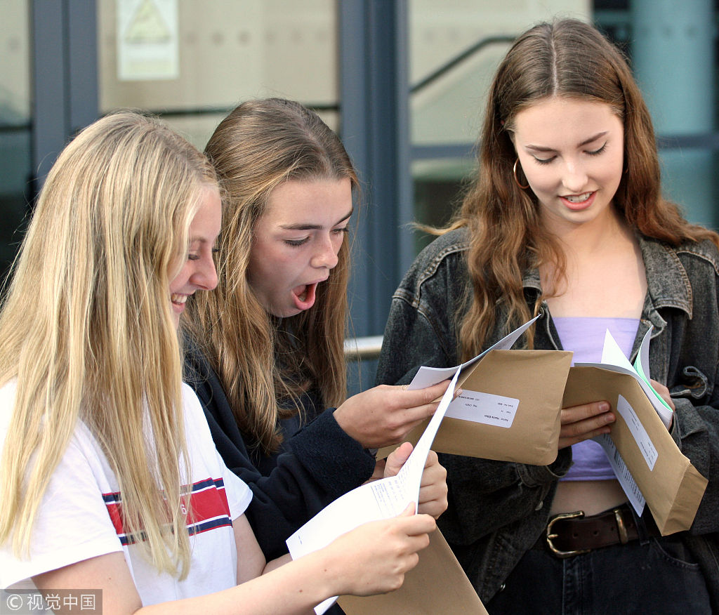 当地时间2018年8月23日,英国“中考”成绩出炉,学生领取考试成绩难掩喜悦。