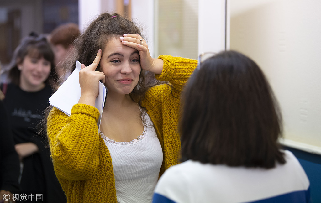 当地时间2018年8月23日,英国“中考”成绩出炉,学生领取考试成绩难掩喜悦。