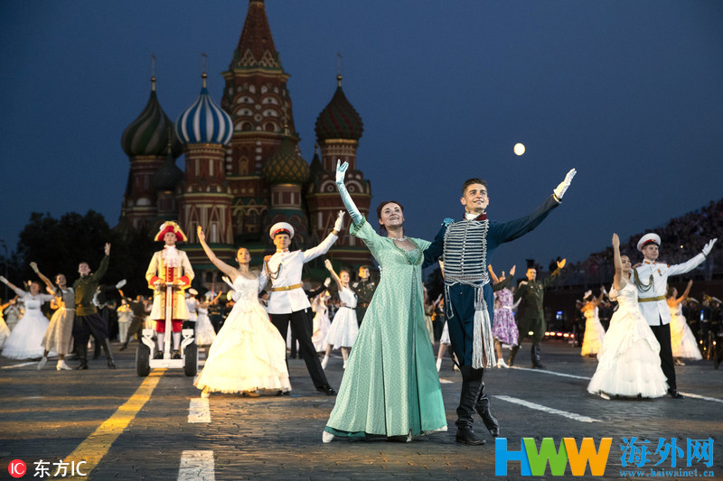 当地时间2018年8月23日,俄罗斯莫斯科,2018俄罗斯“救世主塔楼”国际军乐节在红场举行带妆彩排。