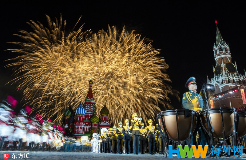 俄罗斯国际军乐节举行带妆彩排 绚烂烟花绽放夜空