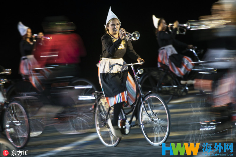当地时间2018年8月23日,俄罗斯莫斯科,2018俄罗斯“救世主塔楼”国际军乐节在红场举行带妆彩排。