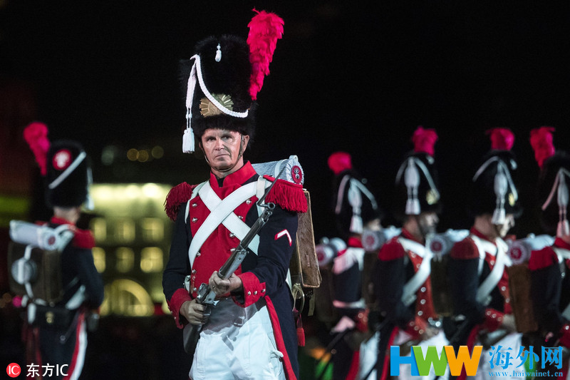 当地时间2018年8月23日,俄罗斯莫斯科,2018俄罗斯“救世主塔楼”国际军乐节在红场举行带妆彩排。