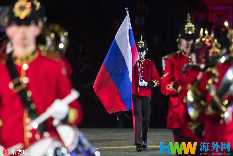 当地时间2018年8月23日,俄罗斯莫斯科,2018俄罗斯“救世主塔楼”国际军乐节在红场举行带妆彩排。