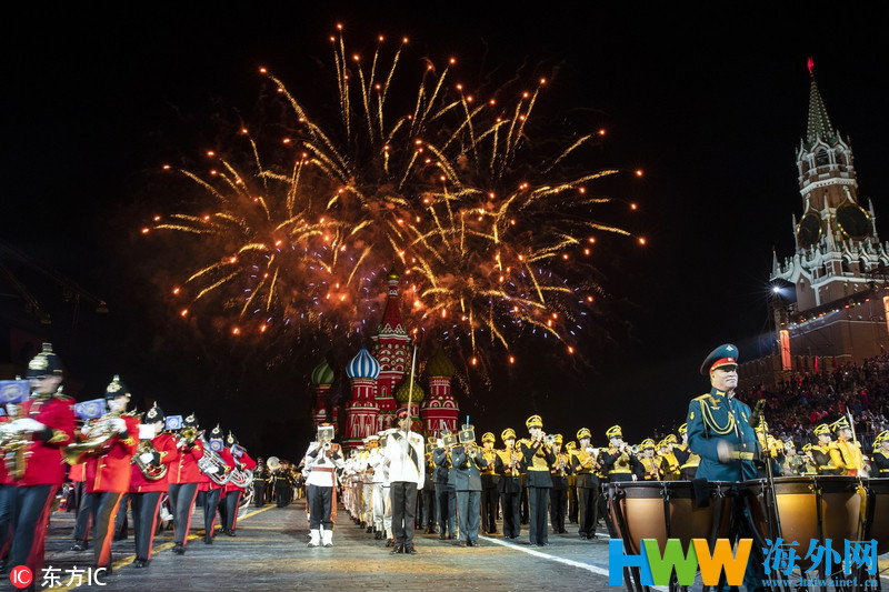 俄罗斯国际军乐节举行带妆彩排 绚烂烟花绽放夜空