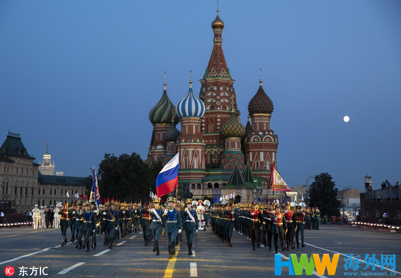 当地时间2018年8月23日,俄罗斯莫斯科,2018俄罗斯“救世主塔楼”国际军乐节在红场举行带妆彩排。