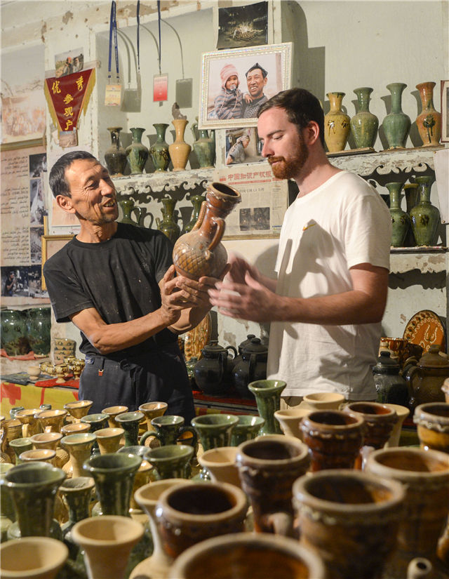 在喀什高台民居里,当地土陶艺人吐尔逊·祖农(左)在向来自澳大利亚的游客介绍自己手工制作的土陶(7月11日摄)。新华社记者赵戈摄