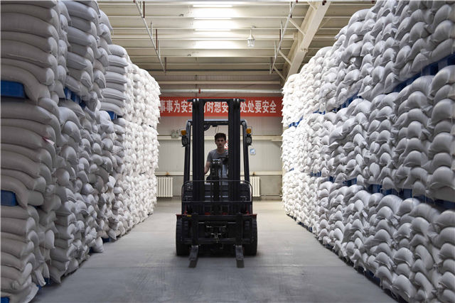 在新疆阿拉山口爱菊秦疆食品有限公司,工作人员准备搬运从哈萨克斯坦进口的面粉(7月4日摄)。新华社记者赵戈摄