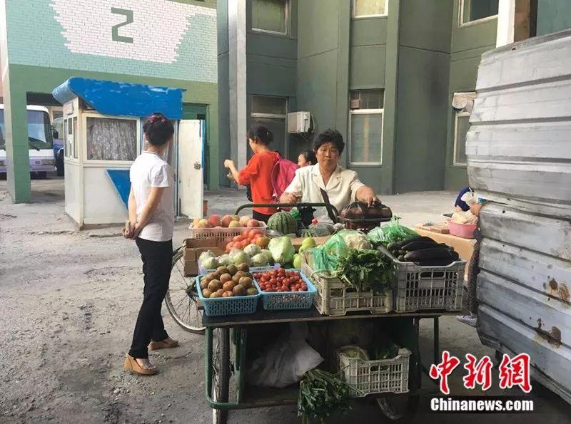 朝鲜人在街边卖蔬菜和水果。中新网记者邱宇摄