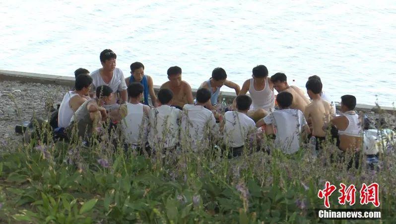 江边草地上,十几名穿白衬衫、白背心的朝鲜小伙正喝酒聊天,因为天热,有人干脆脱掉了上衣。