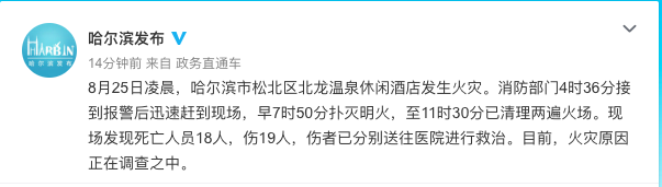 据哈尔滨市委宣传部官方微博消息:截至11时30分,哈尔滨北龙温泉休闲酒店火灾已造成18人死亡,19人受伤,伤者已被送往医院救治。火灾原因正在调查中。