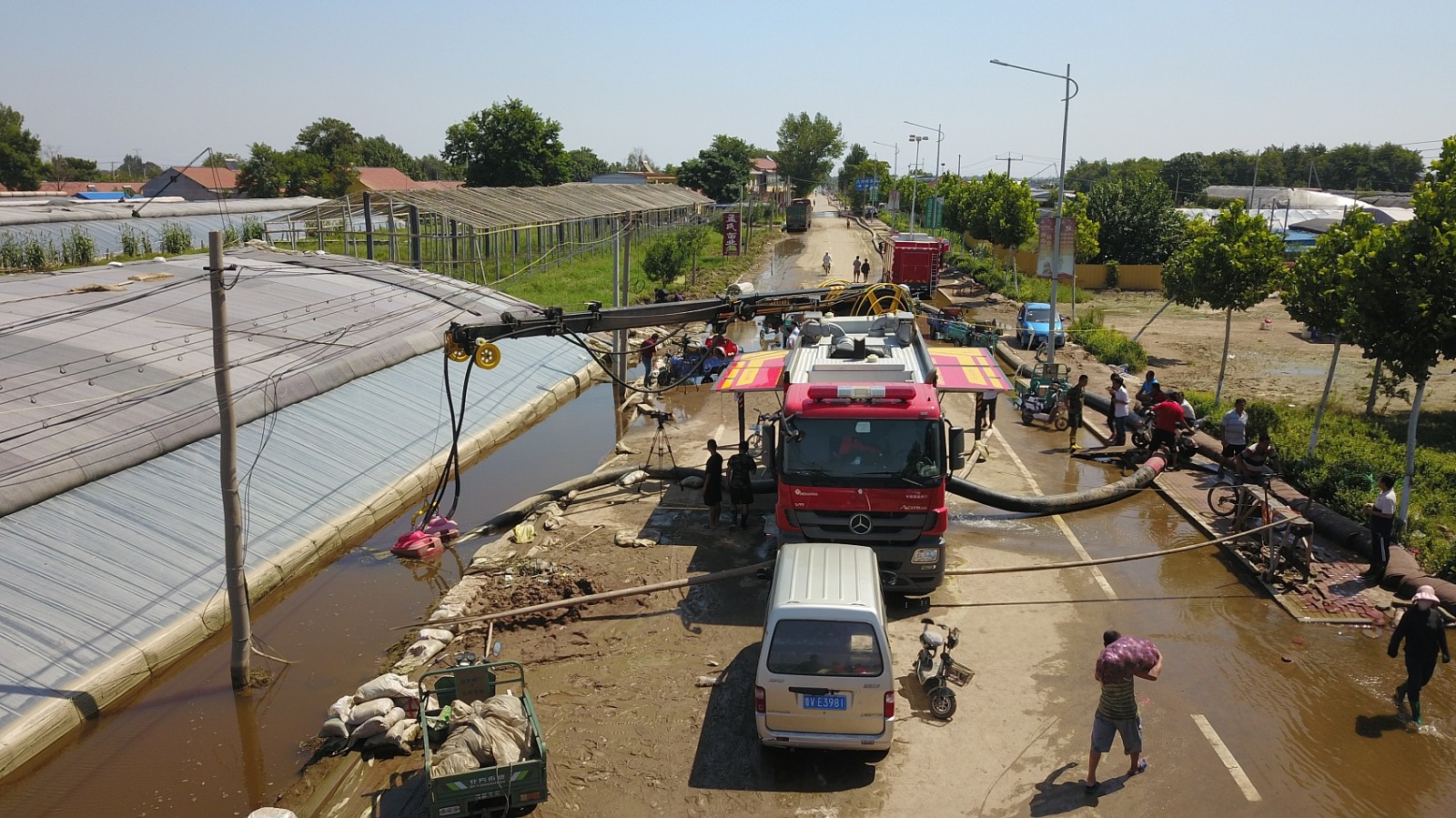 最开始村子和大棚都淹了,现在道路上的水已渐渐抽干,但大棚里依旧有很多积水。(来源:视觉中国)