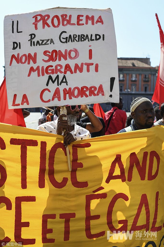 当地时间2018年8月28日,意大利那不勒斯,当地移民因担心自己的庇护申请被拒绝延期或被驱逐出境而举行示威活动。