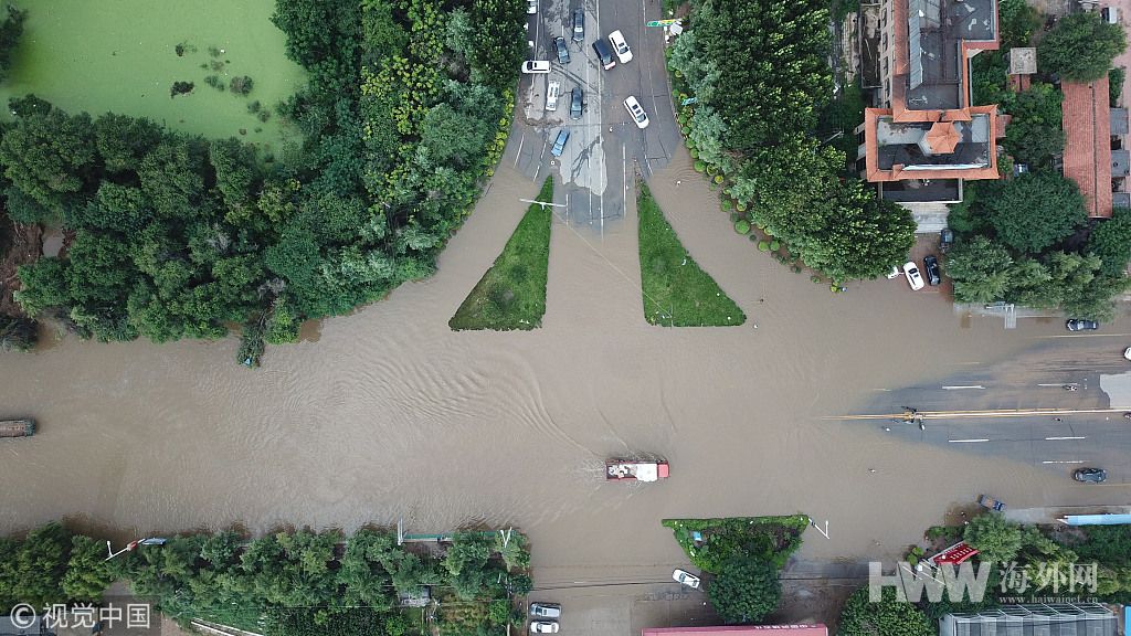 航拍山东寿光救援现场 消防官兵加紧抢险排涝