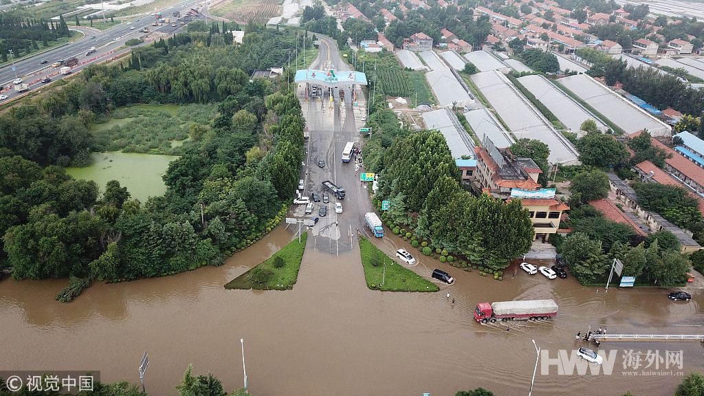 航拍山东寿光救援现场 消防官兵加紧抢险排涝
