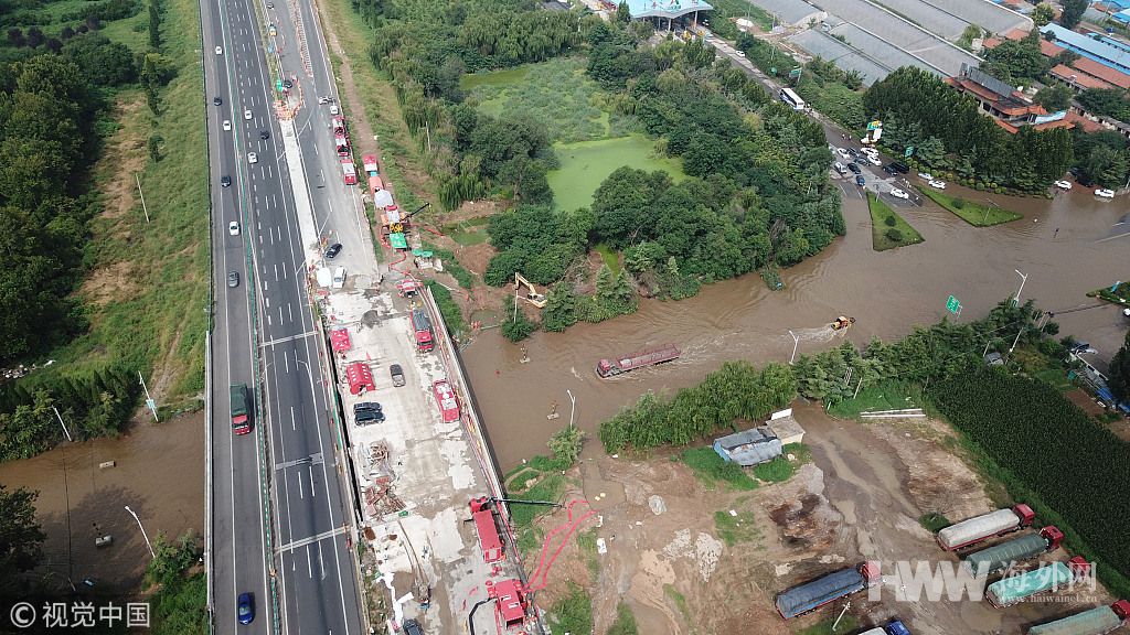 航拍山东寿光救援现场 消防官兵加紧抢险排涝