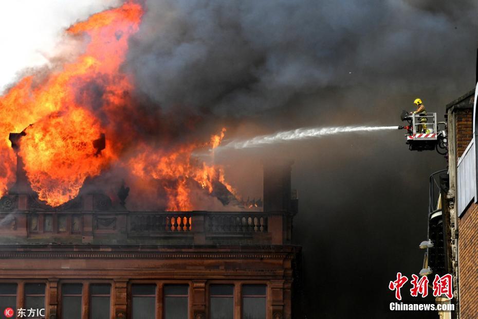 普里马克购物中心位于北爱尔兰的旅游胜地城堡广场,它的前身是一栋银行大楼。图为消防员正在灭火。
