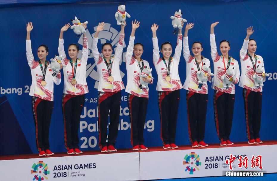 在8月29日下午结束的雅加达亚运会花样游泳集体自由自选比赛中,中国队凭借在曾获世锦赛亚军的经典节目《凤舞国粹》的出色发挥,获得94.4333 的高分,并以总成绩186.9395夺得金牌。这是中国代表团在雅加达亚运会获得的第100枚金牌。中新社记者 杜洋 摄