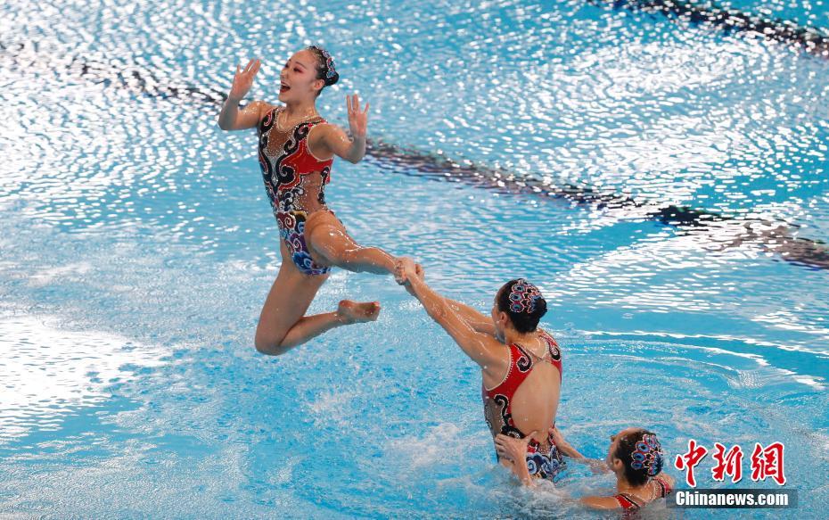 在8月29日下午结束的雅加达亚运会花样游泳集体自由自选比赛中,中国队凭借在曾获世锦赛亚军的经典节目《凤舞国粹》的出色发挥,获得94.4333 的高分,并以总成绩186.9395夺得金牌。这是中国代表团在雅加达亚运会获得的第100枚金牌。中新社记者 杜洋 摄