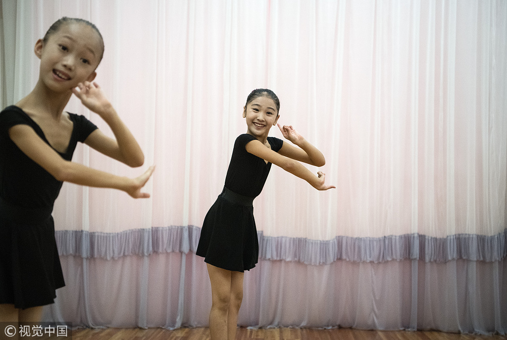 当地时间2018年8月23日,朝鲜平壤,年轻的芭蕾舞演员在在万景台学生少年宫的课堂上练习。