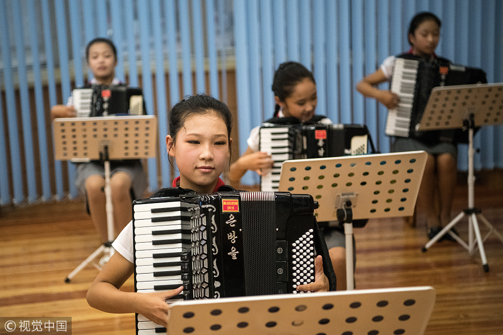 当地时间2018年8月23日,朝鲜平壤,女孩在万景台学生少年宫的音乐课上练习。