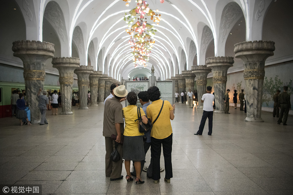 当地时间2018年8月21日,朝鲜平壤,朝鲜人民在平壤地铁车站里看报纸。