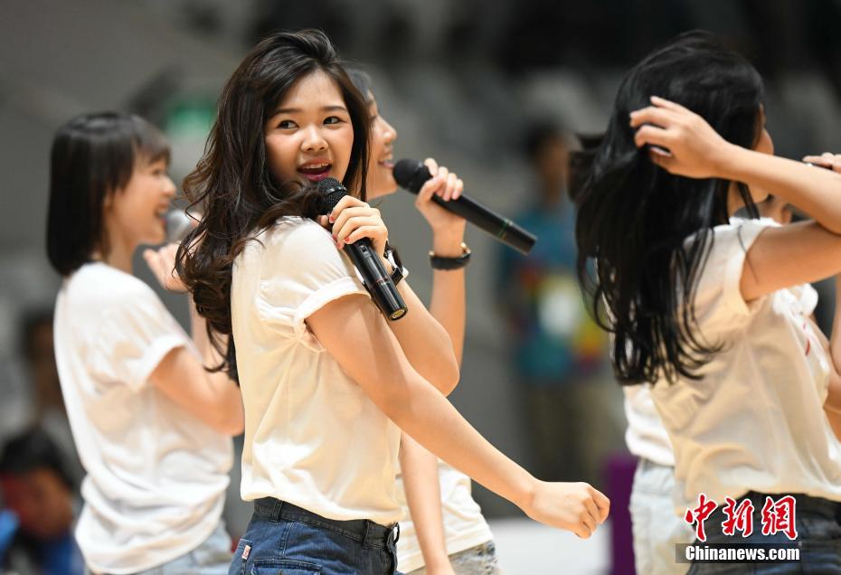 8月30日,印尼美少女组合在亚运会篮球赛场火热演出,赢得观众阵阵掌声。中新社记者  王东明 摄