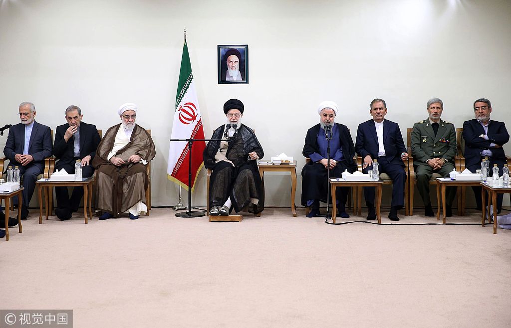 当地时间2018年8月29日,伊朗德黑兰,伊朗总统鲁哈尼与他的内阁成员一起会见伊朗最高领袖哈梅内伊。尽管鲁哈尼近期因应对经济困境不利而遭到议会的质询,他依然得到了最高领袖哈梅内伊的保护。哈梅内伊表示,罢免总统将使伊朗“被敌人把玩于股掌之间”。