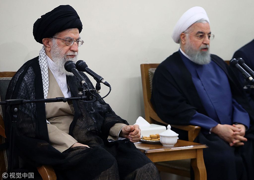 当地时间2018年8月29日,伊朗德黑兰,伊朗总统鲁哈尼与他的内阁成员一起会见伊朗最高领袖哈梅内伊。尽管鲁哈尼近期因应对经济困境不利而遭到议会的质询,他依然得到了最高领袖哈梅内伊的保护。哈梅内伊表示,罢免总统将使伊朗“被敌人把玩于股掌之间”。