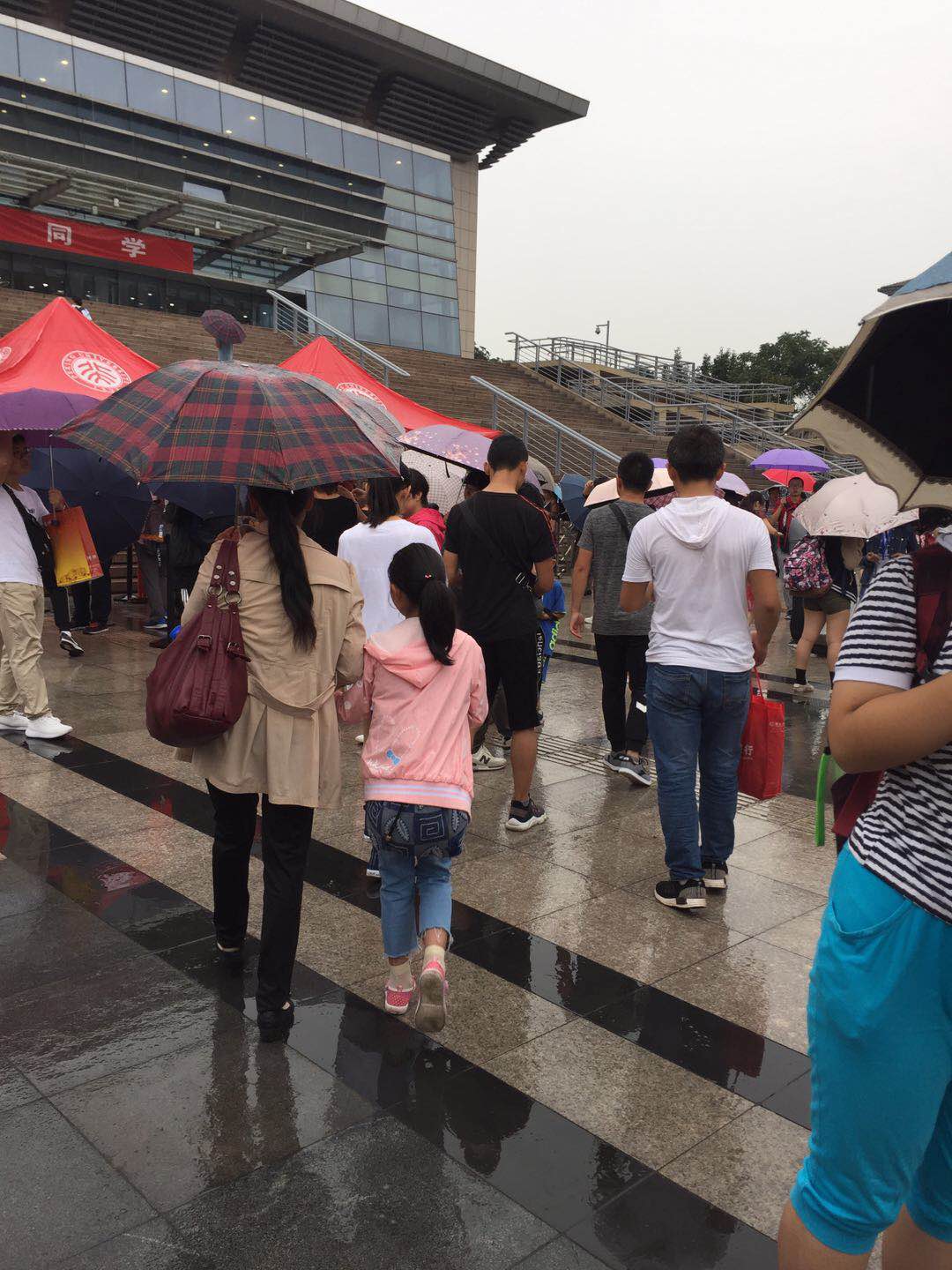 今天早上8点40左右,天空中飘着细雨,崔庆涛在父亲的陪同下来到北大邱德拔体育馆正门外等候,一同前来的还有同一县城考上北大医学部的另一个小伙子。眼前的崔庆涛个不高,话也不多,他戴着黑框眼镜,穿着白色体恤、牛仔裤和黑色运动鞋,拎着一个红色手提袋,因为没有撑伞,头发已被雨水淋湿,看上去朴实又憨厚。