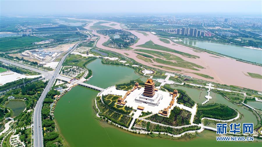 位于吴忠市青铜峡市的黄河楼及周边景色(6月26日无人机拍摄)。