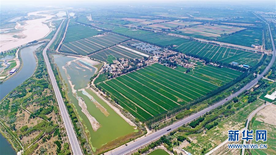 吴忠市境内黄河岸边的良田(6月26日无人机拍摄)。 新华社记者 王鹏 摄
