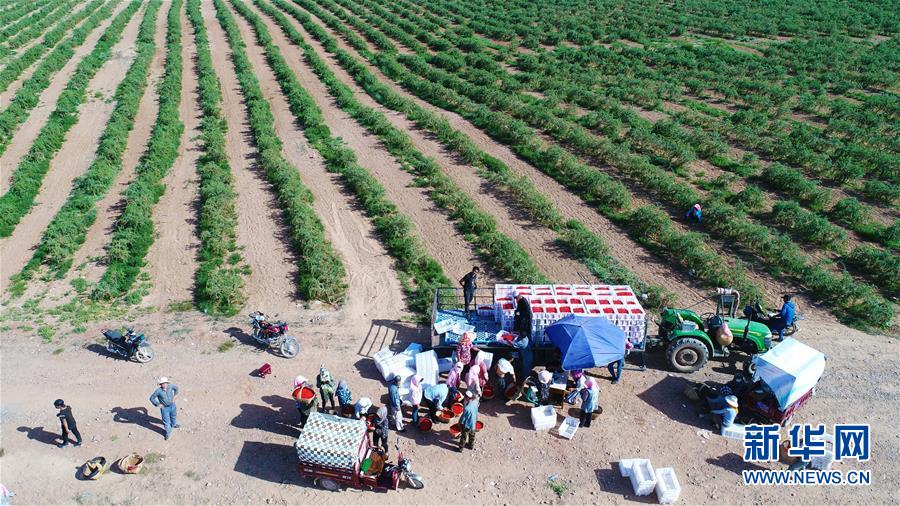 吴忠市同心县同德村村民在采摘枸杞(6月22日无人机拍摄)。 新华社记者 王鹏 摄