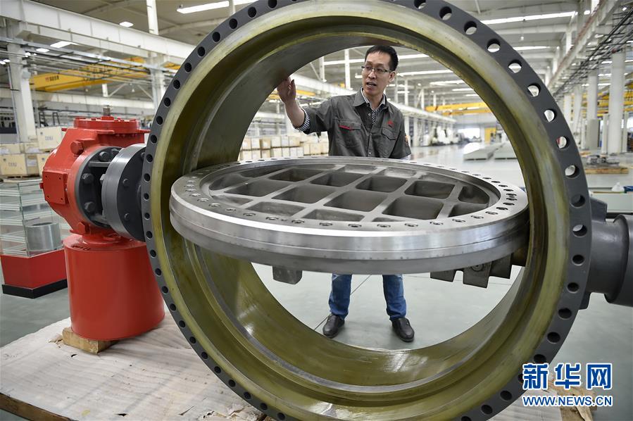 在吴忠仪表有限责任公司自动化产业园,工作人员在介绍大型智能控制阀(5月16日摄)。新华社记者 王鹏 摄