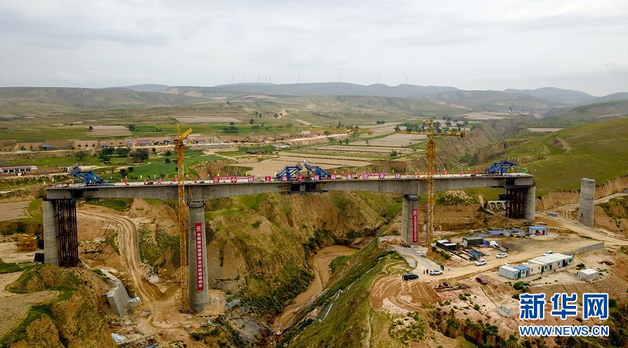 8月25日无人机拍摄的银西高铁马坊沟特大桥连续梁合龙现场。马坊沟特大桥连续梁顺利合龙,标志着银西高铁宁夏段建设开始转入架梁以及桥梁上部铺设道砟、轨道等施工阶段。新华社记者 郭绪雷 摄