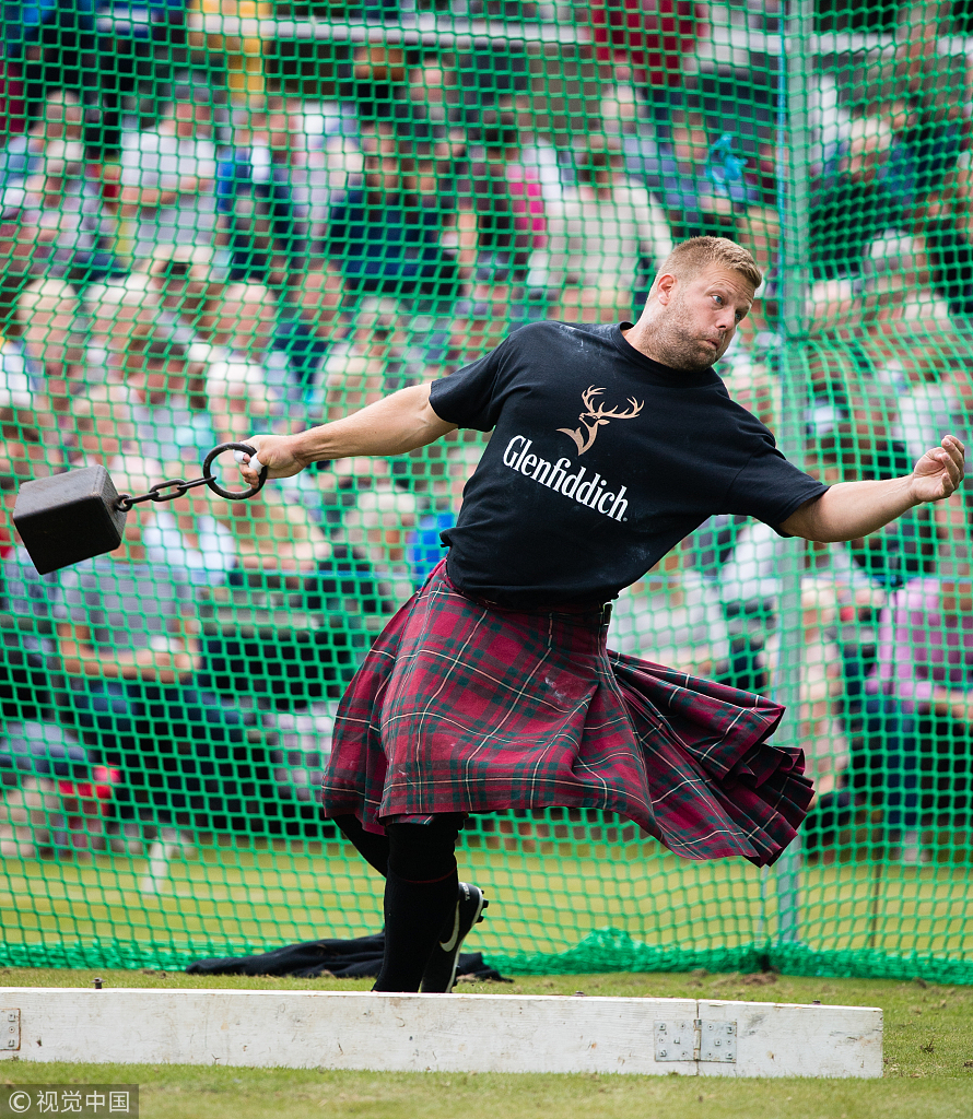 苏格兰高地运动会举行 壮汉穿裙掷链球画风有趣