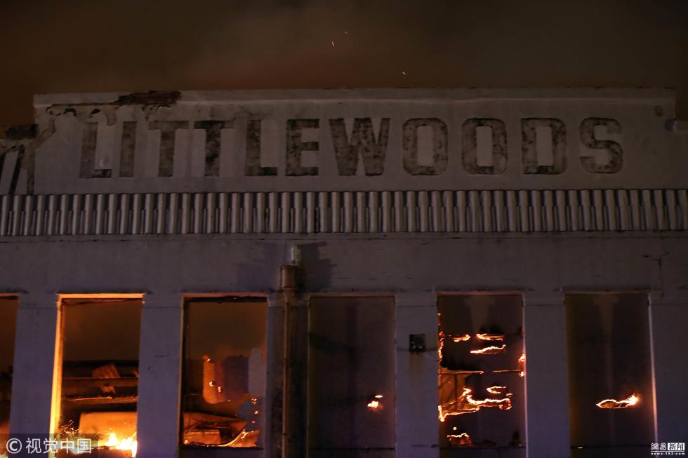 当地时间2018年9月2日,英国利物浦,利物浦标志性建筑利特尔伍兹彩票公司大楼起火。