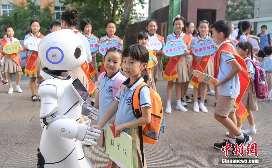 9月3日,山东师范大学附属小学济南校本部智能机器人迎新生入学。当日,济南市多所中小学迎来新学期开学。 中新社记者 张勇 摄