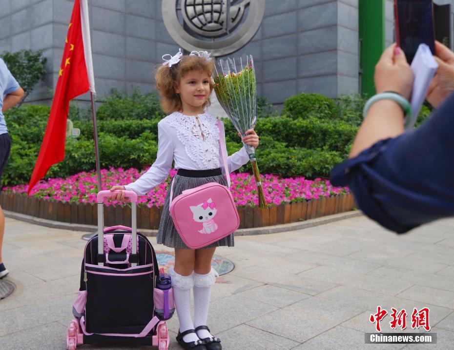 9月1日,北京市朝阳区芳草地国际学校举行开学典礼,一位外籍小学生与家长告别。当日,北京市多所中小学正式开学。 中新社记者 贾天勇 摄