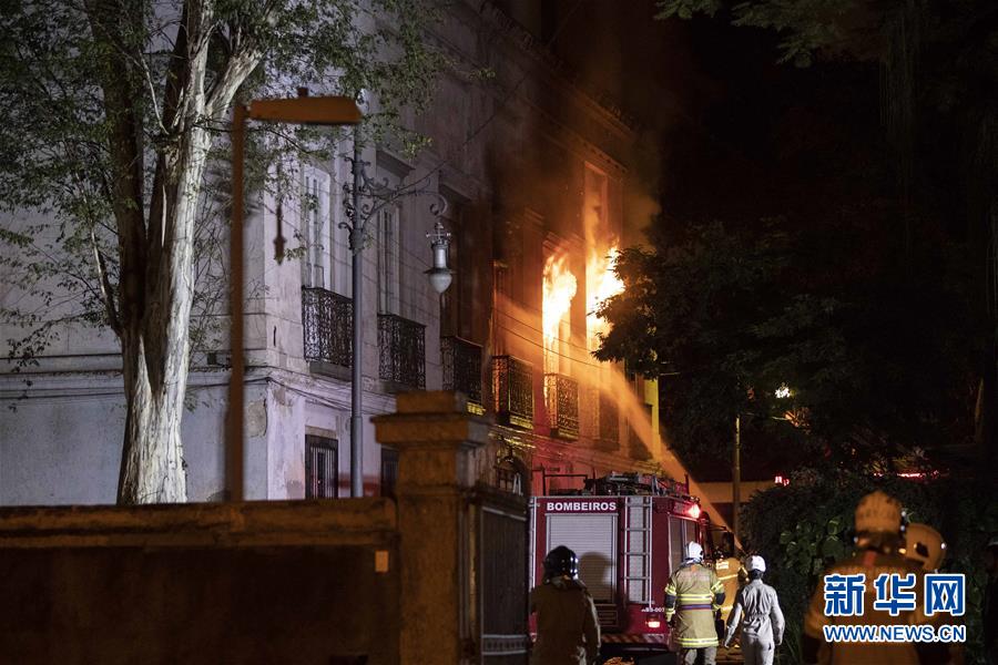 9月2日,在巴西里约热内卢,消防员在火灾现场灭火。位于里约热内卢市北区、拥有2000万件藏品的巴西国家博物馆2日晚发生火灾,由于火势难以控制,所有藏品恐已被烧毁。新华社记者李明摄