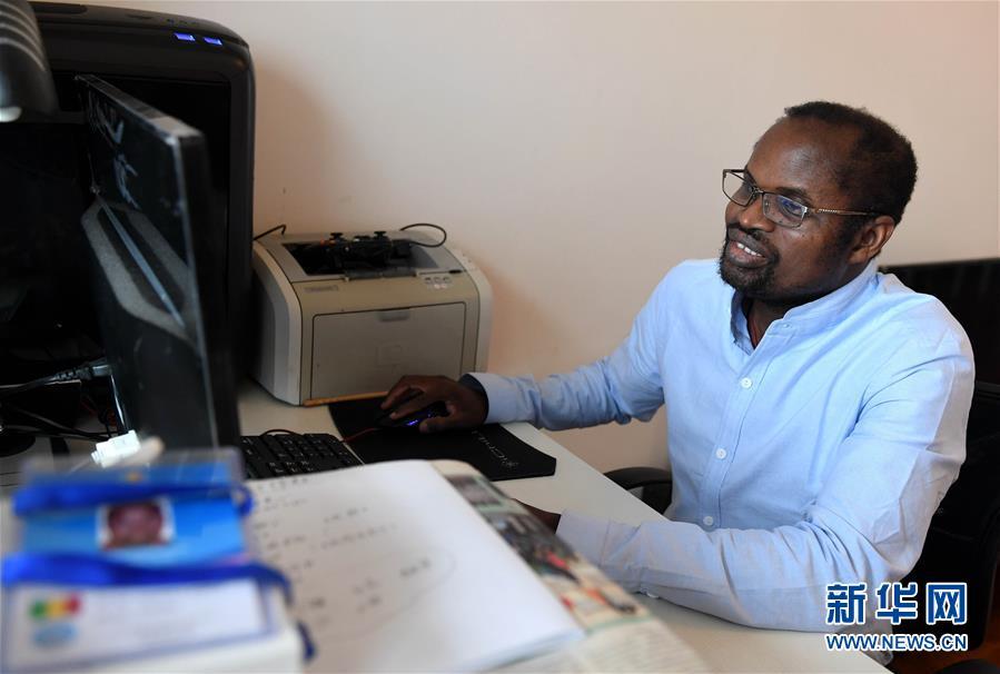 迪亚拉在昆明的家里使用电脑整理有关乡村医生培训的资料(8月28日摄)。 新华社记者 蔺以光 摄