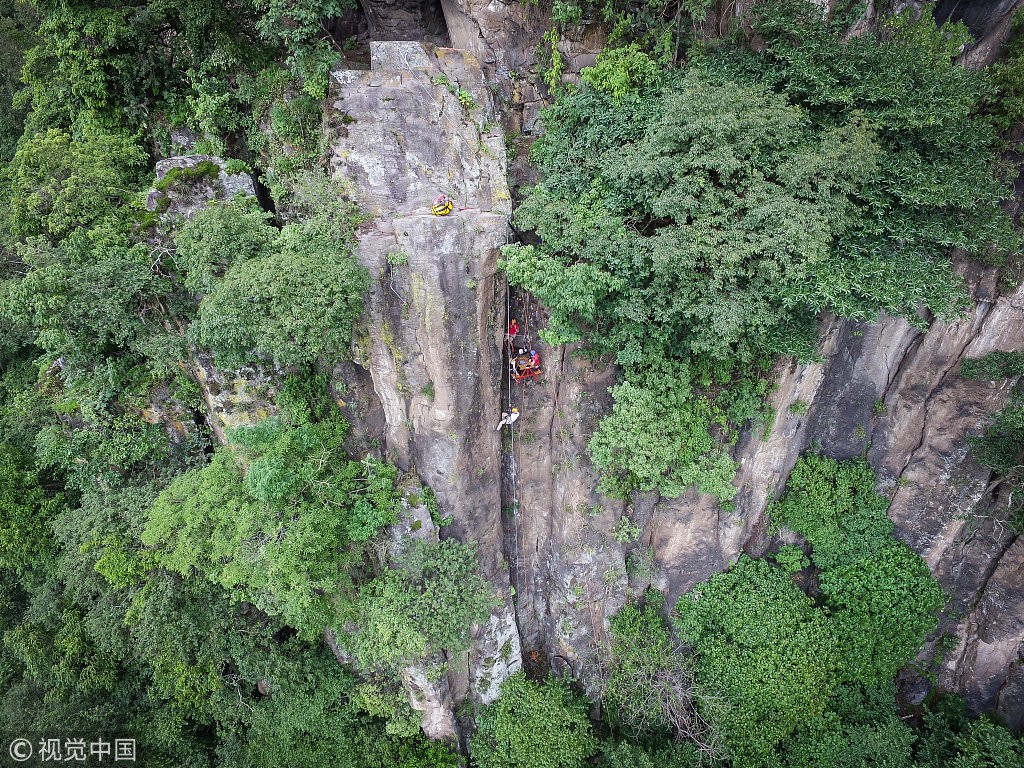 Pablo Cabrera和Maria Mercedes爬上山顶,坐在摆好的野餐桌上,Pablo的朋友们用滑轮把他们从悬崖上往下放降到330英尺的高度,Pablo在半空中向女友求婚。