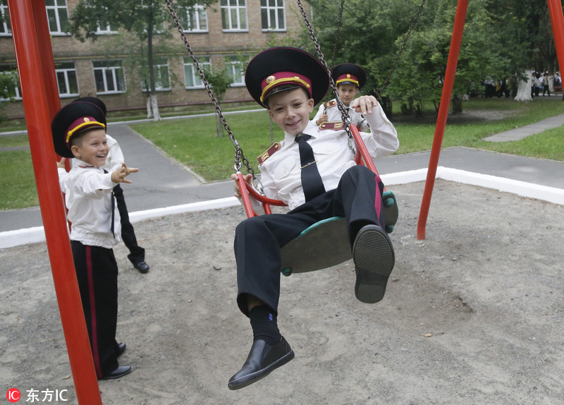 当地时间2018年9月3日,乌克兰基辅,当地一所少年军校迎来“知识日”,即开学首日,小学员身穿军装返校上课。乌克兰的“知识日”标志着新学年的开始。