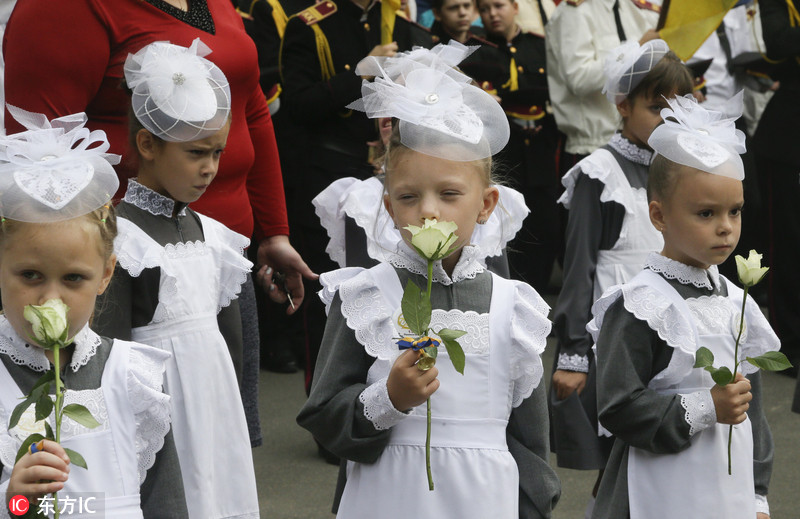 当地时间2018年9月3日,乌克兰基辅,当地一所少年军校迎来“知识日”,即开学首日,小学员身穿军装返校上课。乌克兰的“知识日”标志着新学年的开始。